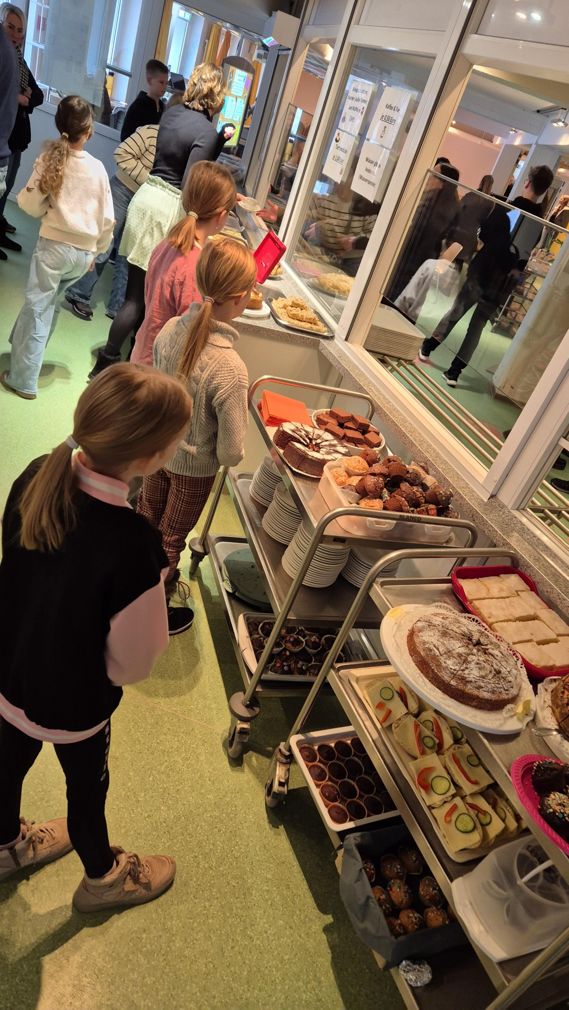 Auch das leibliche Wohl kam nicht zu kurz: Bei Kaffee, Kuchen und Waffeln konnten sich die Gäste in der Mensa stärken und miteinander ins Gespräch kommen. Ergänzt wurde das Angebot durch vielfältige Infostände, unter anderem zu den Themen Ganztag, Erprobungsstufe, Mittagsfreizeit,Begabtenförderung, Bildung für nachhaltige Entwicklung (BNE) sowie zu den Fremdsprachen am AMG.